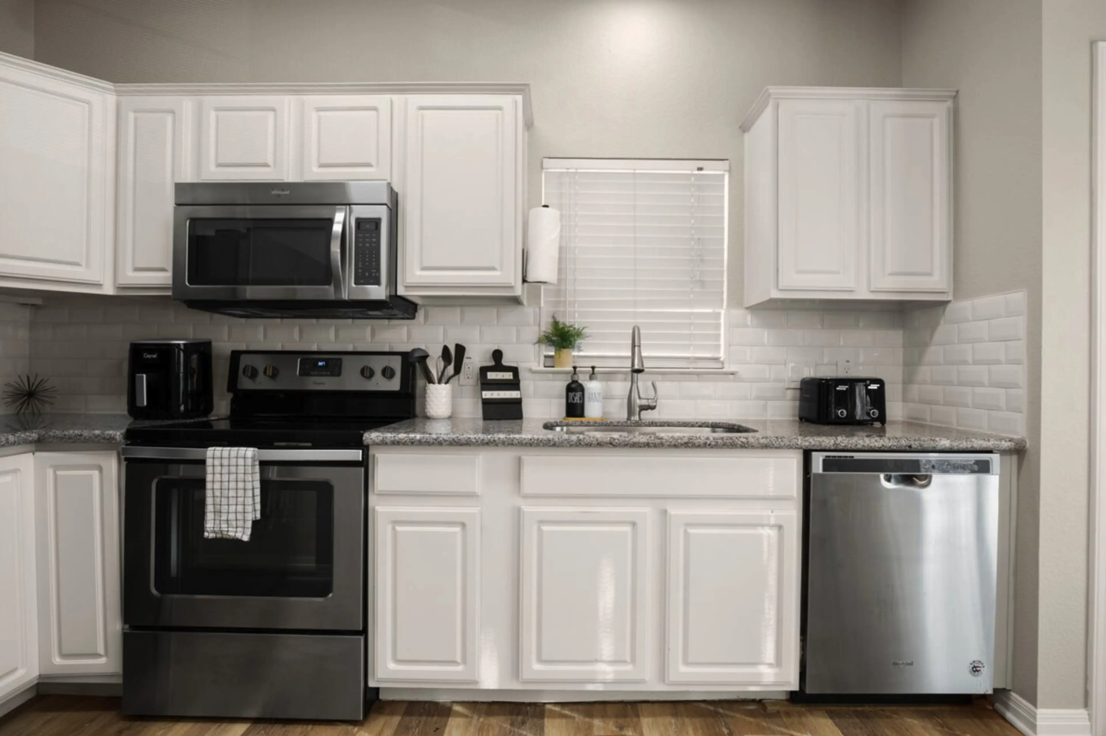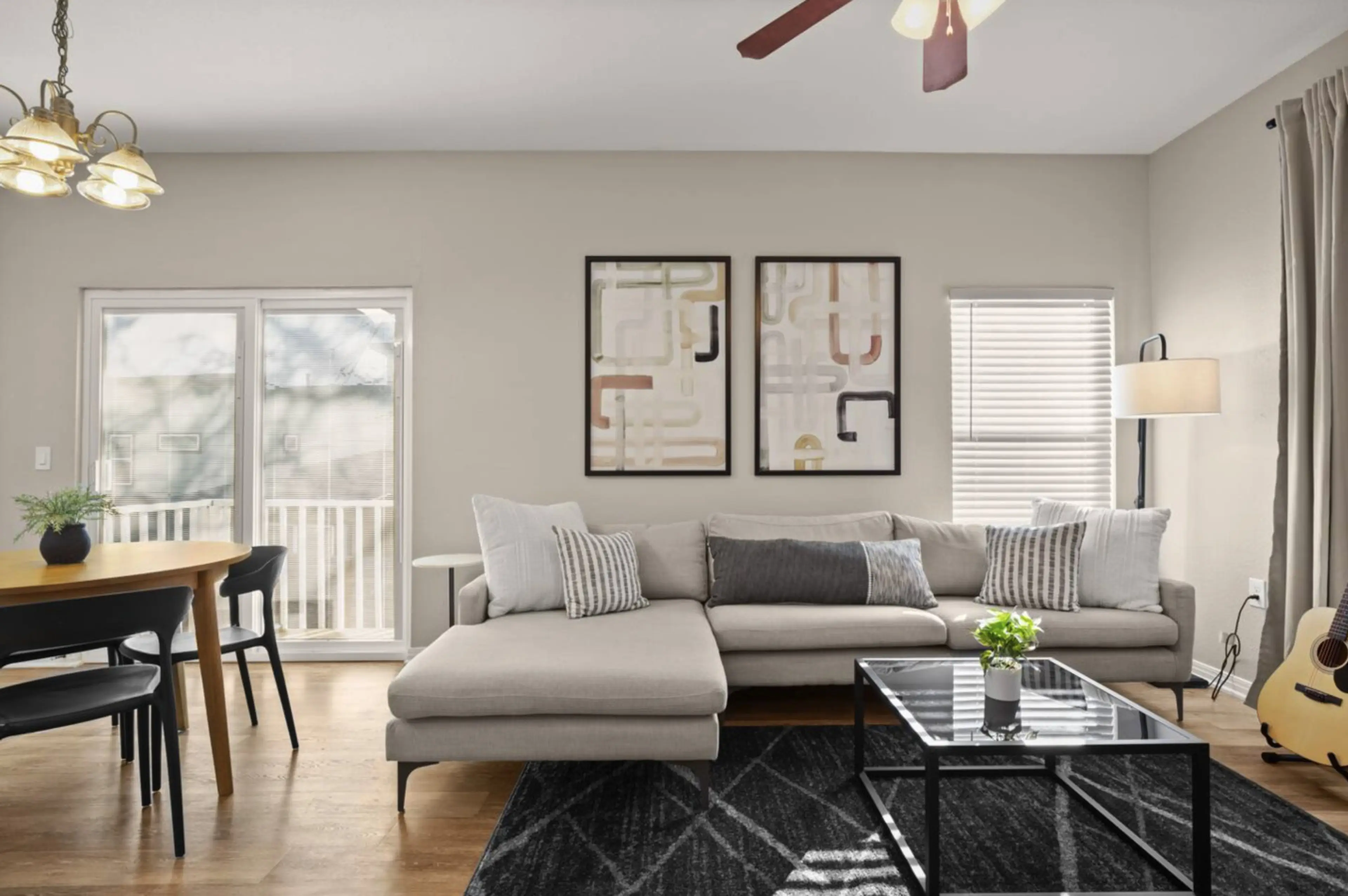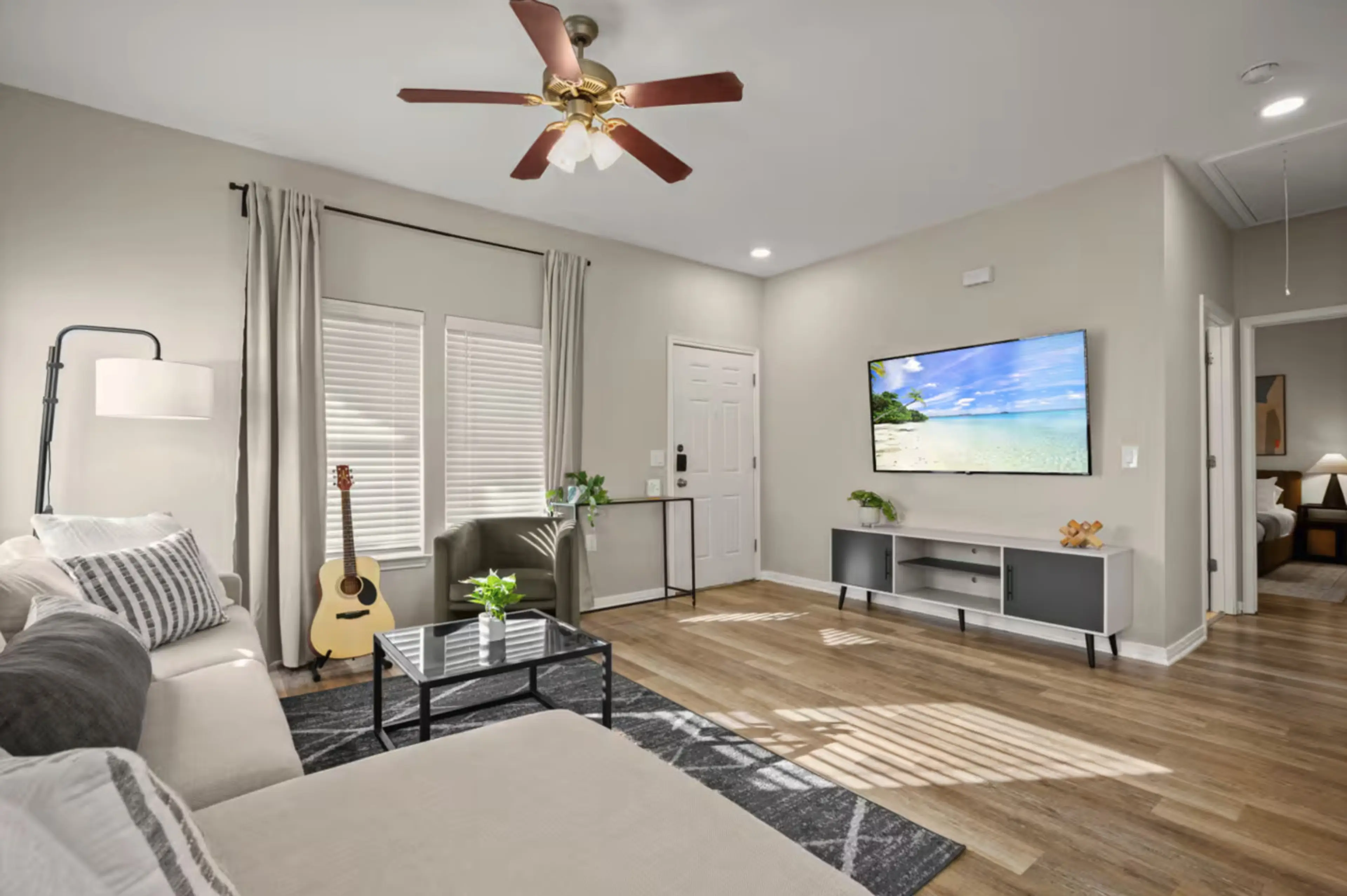 Feel right at home in this bright and modern 2-bedroom, 1-bath retreat located just minutes from Downtown Austin. Designed with comfort and style in mind, the space features an airy open layout, a cozy living area with a navy sectional, a fully equipped kitchen, and a charming dining nook. Each bedr...